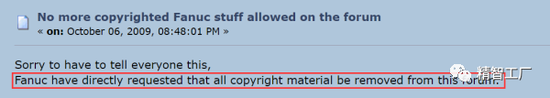 在2009年,發(fā)那科通知著名的工業(yè)機(jī)器人論壇Robotforum Support for Robotprogrammer and Users - Index刪除其網(wǎng)站上所有網(wǎng)友分享的發(fā)那科機(jī)器人的隨機(jī)文檔和技術(shù)資料,有理由相信其他的討論平臺同樣收到了類似的通知: